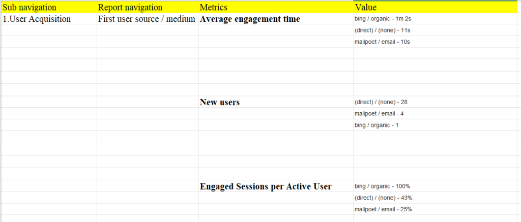 Overall, your data suggests you’re relying heavily on direct traffic for new users, while email is minor and organic search is barely contributing to new user acquisition.