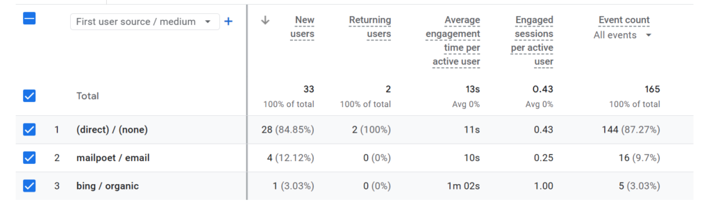 A small number of new users are coming from your email campaigns. This means your email is generating some new traffic, but it’s not a major acquisition source right now.