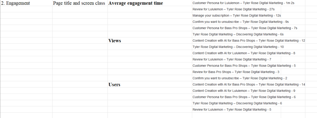 This is showing how long users stay engaged on each page (Page Title / Screen Class), sorted from highest to lowest.