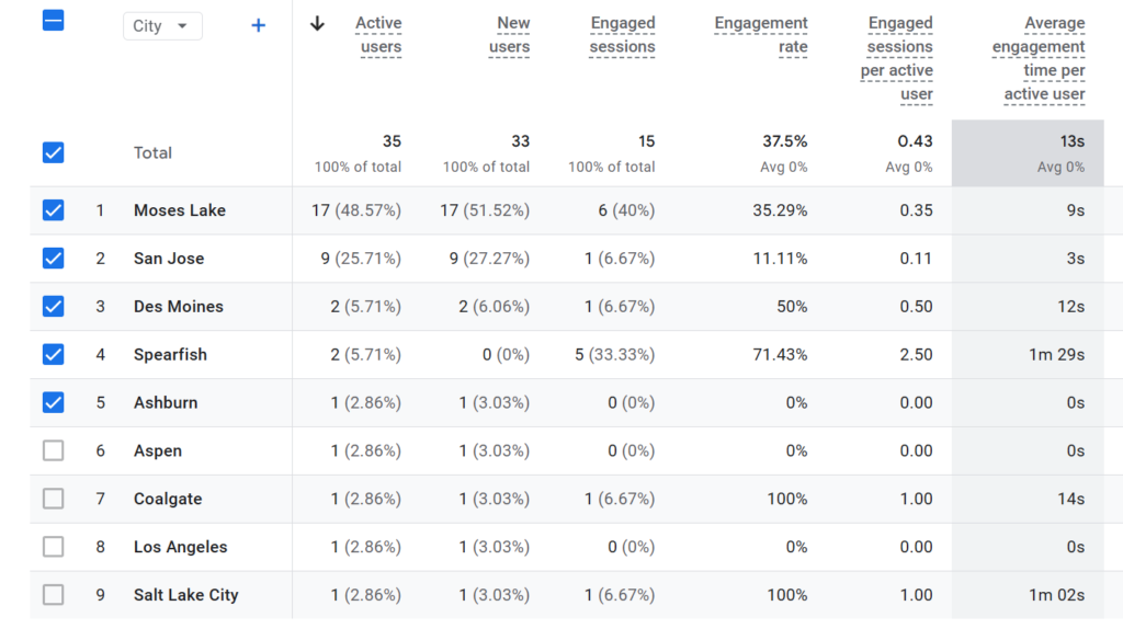 These cities show perfect engagement, but this usually happens when traffic volume is very low. It likely means only a small number of sessions occurred, and all of them met the engagement threshold. With tiny sample sizes, 100% is common but not necessarily meaningful statistically.