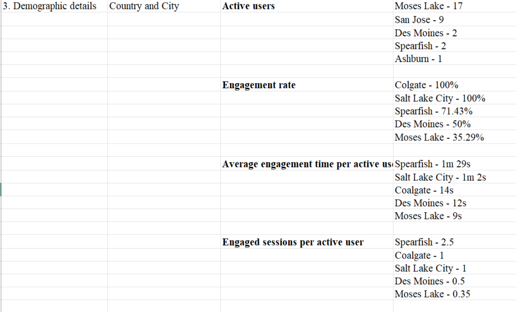 This shows engagement rate by city, sorted from highest to lowest. Engagement rate tells you the percentage of sessions that were “engaged” (i.e., lasted long enough, had interaction, or met engagement criteria in GA4).